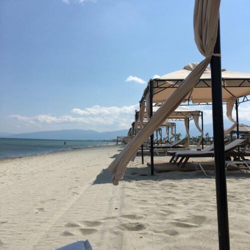 Ein weiterer Tipp ist Chalkidiki. Hier haben wir ein bisschen mehr Zeit eingeplant um an den „Orange Beach Club“ zu fahren, der sich am mittleren Finger von Chalkidiki befindet. Nach ca. 2,5 Stunden Fahrt erreichten wir die Bucht. Die Fahrt hatte sich wirklich gelohnt und man wurde durch den Anblick des weißen Sandstrandes und des kristallklaren blauen Wassers entschädigt.