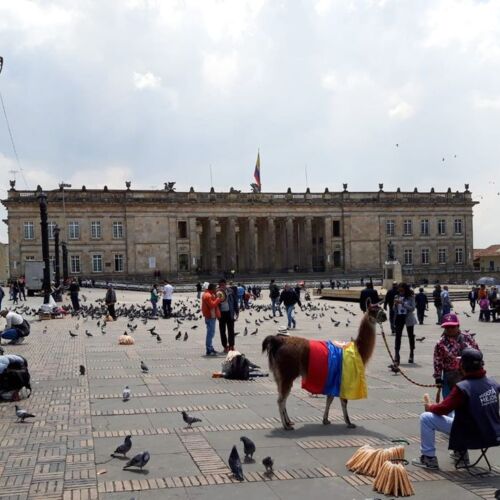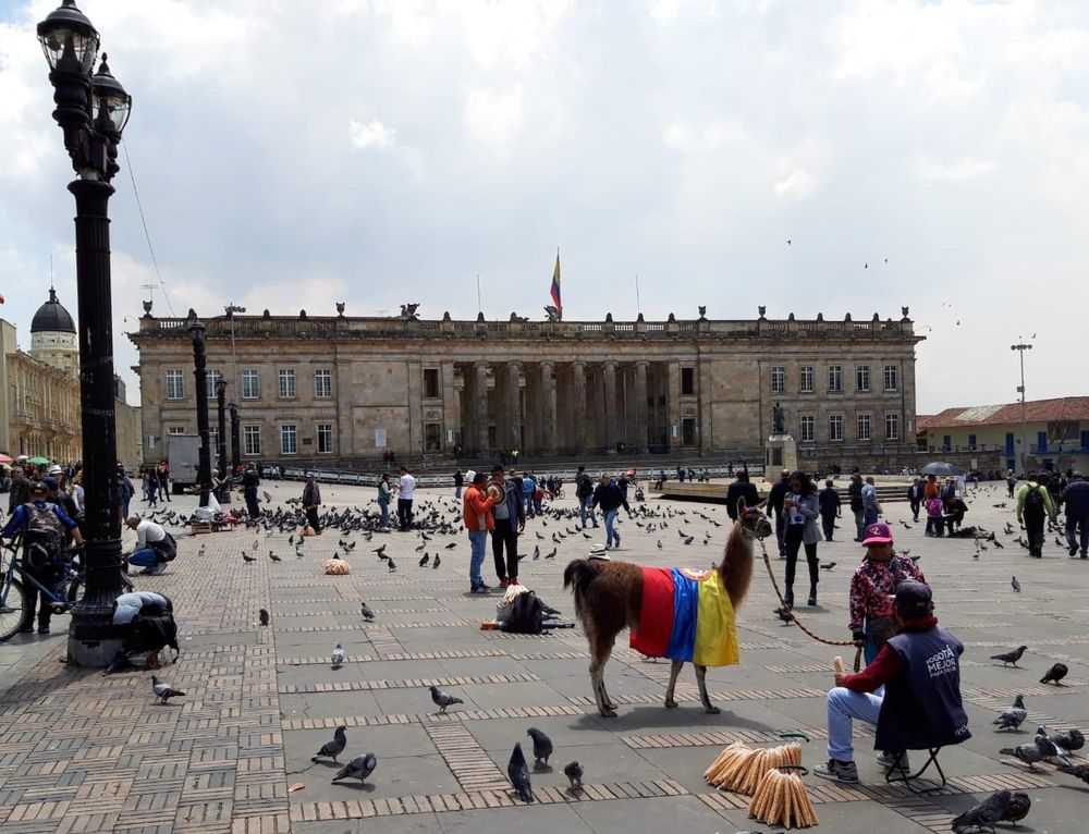 Etwa 100 wie auf einem Schachbrett angeordnete, mit Häusern bebaute Quadrate bedecken die von der Plaza Bolívar nach Osten hin in Richtung Monserrate reichende schiefe Ebene. Wir steifen wir durch die engen, kopfsteingepflasterten Straßen und lassen uns von Bogotás Streetart inspirieren bis wir am Plaza Bolívar sind. Dieser gewaltige, baumlose Platz ist das Regierungszentrum von Bogotá und Herz der Stadt. Der Platz ist gefüllt mit Touristen, Straßenverkäufern und Tauben.