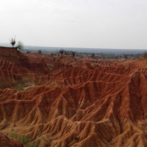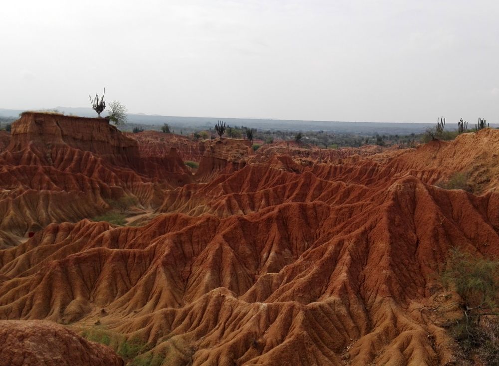 Nach einer kurzen Nacht geht es am frühen Morgen mit dem Bus, in einer guten Stunde, in die Tatacoa Wüste. Wir wandern bei brütender Hitze durch ein Gebiet aus welligem, rotem Land in das die Erosion bis zu 20 Meter tiefe bizarre Canyons gefressen hat und erleben eine Landschaft, die wir so in Kolumbien nicht erwartet hätten. Hier erlebten wir zum ersten Mal wie vielseitig dieses atemberaubende Land sein kann. Pünktlich zur Mittagshitze verlassen wir die Tatacoa Wüste.